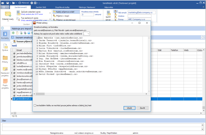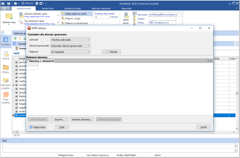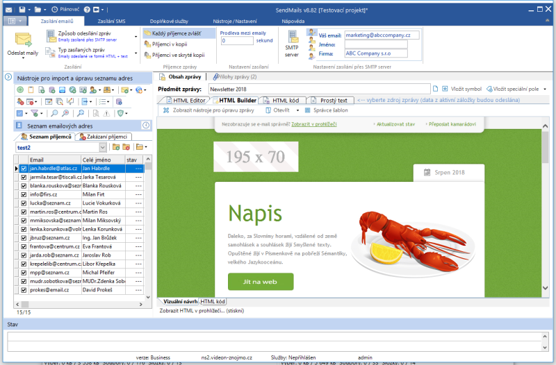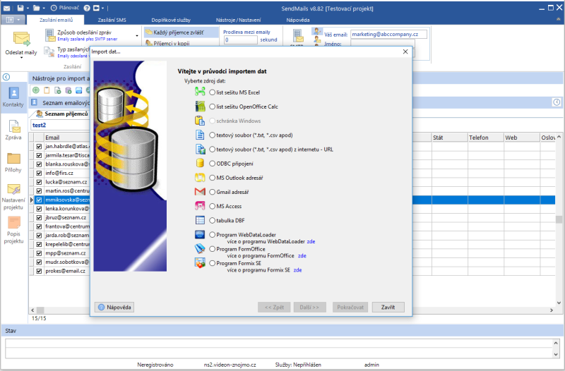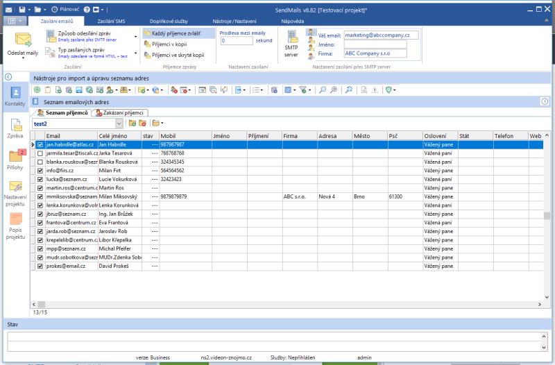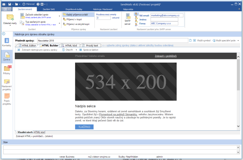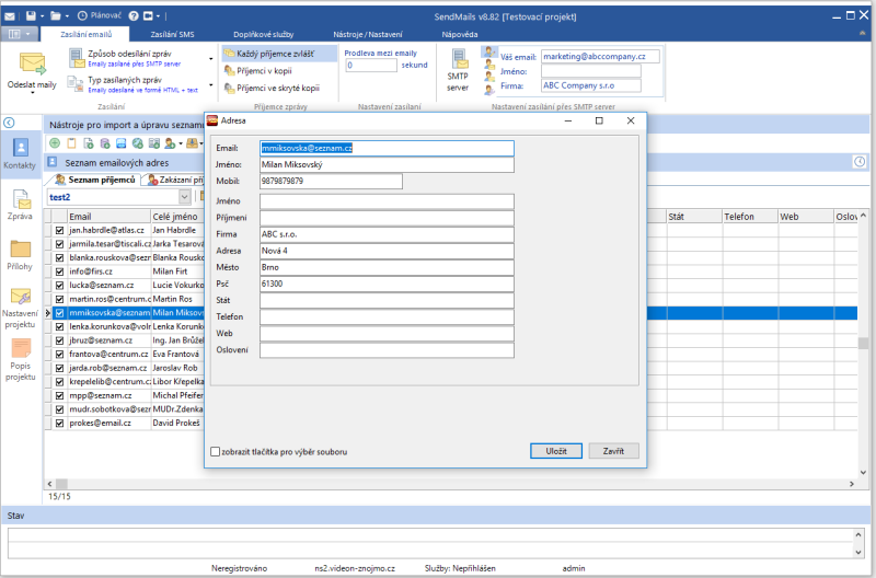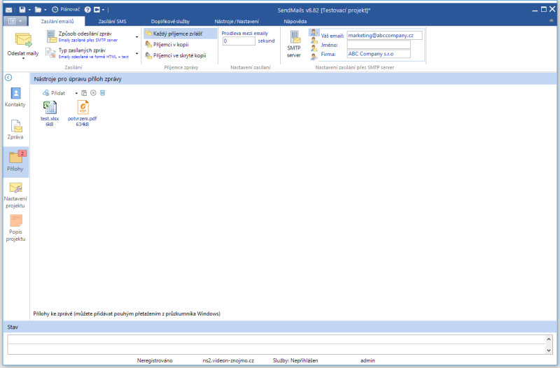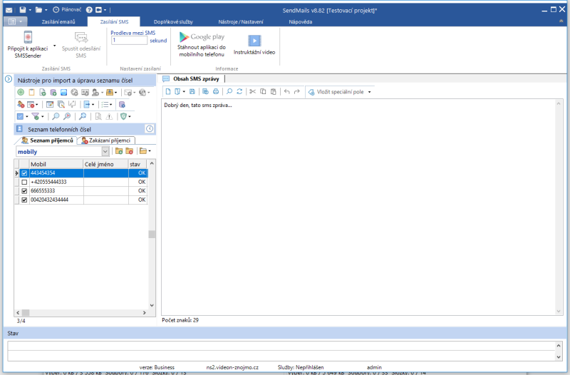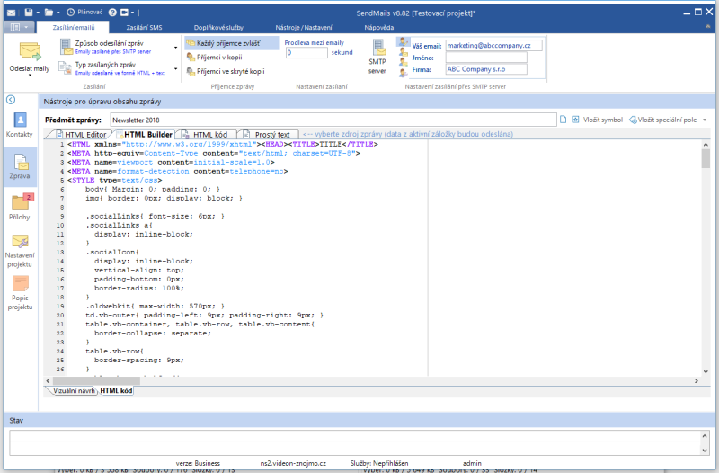 Náhledy obrazovek Zobrazit vše Hlavní Kontakty Zprávy Přílohy SMS Hlavní okno Seznam kontaktů Editace kontaktu Import kontaktů Hromadná úprava kontaktů GDPR vyhledávání v kontaktech Editor zpráv Editor zpráv - šablona Editor zpráv - HTML kód Editor zpráv - celá obrazovka Přílohy zprávy Zasílání SMS Zasílání SMS - aplikace